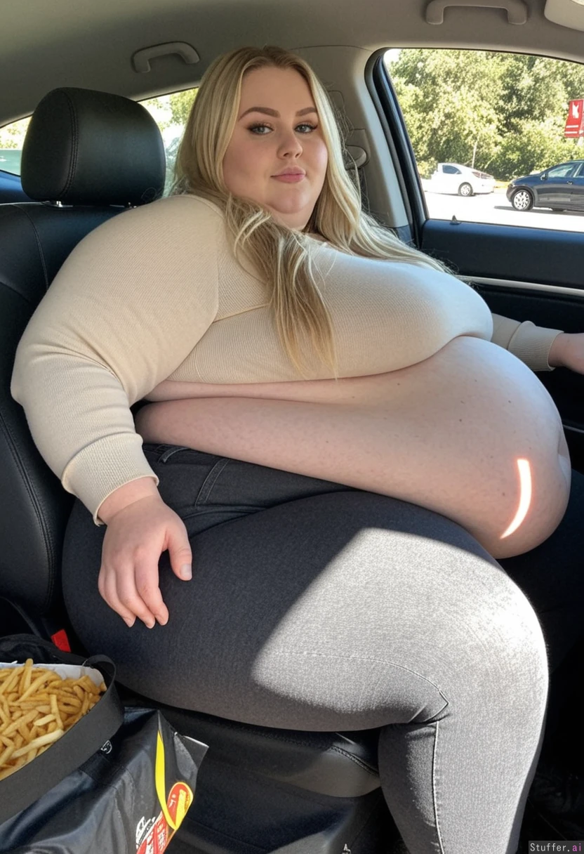 Full body shot, Long blonde hair, blue eyes, 33-years-old, tall wide voluptuous morbidly obese Ussbbw woman, bottom-heavy feminine build, wearing very tight, dark grey high waist jeans,a beige sweater, black boots, sitting in her car, driving, wide face, she has hyper wide hips, extra thick legs, meaty rump, love handles, driving with a tired Look in her eyes, weight gain visible, her massive body taking up a lot of space on her seat, thighs spiling over at the sides, feedee, a bag of fattening food from mcdonalds next to her, massive, expanding blubber, humongous thighs and ass