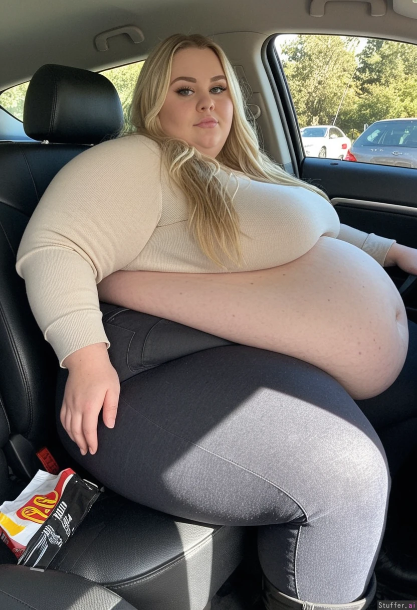 Full body shot, Long blonde hair, blue eyes, 33-years-old, tall wide voluptuous morbidly obese Ussbbw woman, bottom-heavy feminine build, wearing very tight, dark grey high waist jeans,a beige sweater, black boots, sitting in her car, driving, gorgeous wide face, she has hyper wide hips, extra thick legs, meaty rump, love handles, driving with a tired content Look in her eyes, weight gain visible, her massive body taking up a lot of space on her seat, buttocks and thighs spiling over at the sides, feedee, a bag of fattening food from mcdonalds next to her, massive, expanding blubber, humongous thighs, calves and ass getting fatter, thick feedee, overeating blob