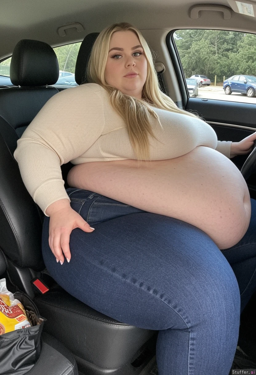 Full body shot, Long blonde hair, blue eyes, 33-years-old, tall wide voluptuous morbidly obese huge Ussbbw woman, bottom-heavy pear-shaped feminine build, wearing very tight, dark grey high waist jeans,a beige sweater, black boots, sitting in her car, driving, gorgeous wide face, she has hyper wide hips, extra thick legs, meaty rump, love handles, driving with a tired content Look in her eyes, weight gain visible, her massive body taking up a lot of space on her seat, gigantic buttocks and thighs spiling over at the sides, feedee, a bag of fattening food from mcdonalds next to her, massive, expanding blubber, humongous thighs, calves and ass getting fatter, thick feedee, overeating blob