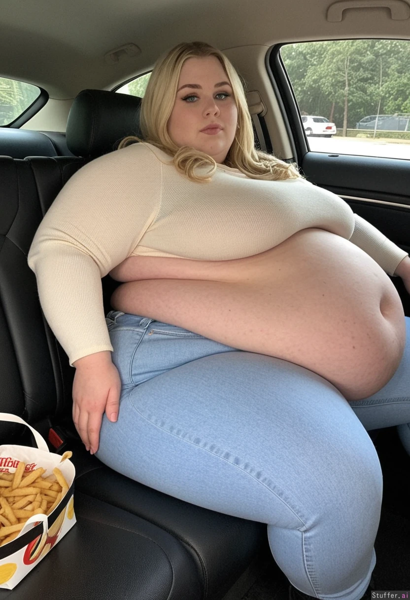 Full body shot, Long blonde hair, blue eyes, 33-years-old, tall wide voluptuous morbidly obese huge Ussbbw woman, bottom-heavy pear-shaped feminine build, wearing very tight, light blue high waist jeans,a beige sweater, black boots, sitting in her car, driving, gorgeous wide face, she has hyper wide hips, extra thick legs, meaty rump, love handles, driving with a tired content Look in her eyes, weight gain visible, her massive body taking up a lot of space on her seat, her gigantic buttocks and thighs spiling over at the sides spilling onto the seat next to her, feedee, a bag of fattening food from mcdonalds next to her, massive, expanding blubber, humongous thighs, calves and ass getting fatter, thick feedee, overeating blob, overstuffed, greedy immobile chonker, huge hanging belly and breasts, massive arms