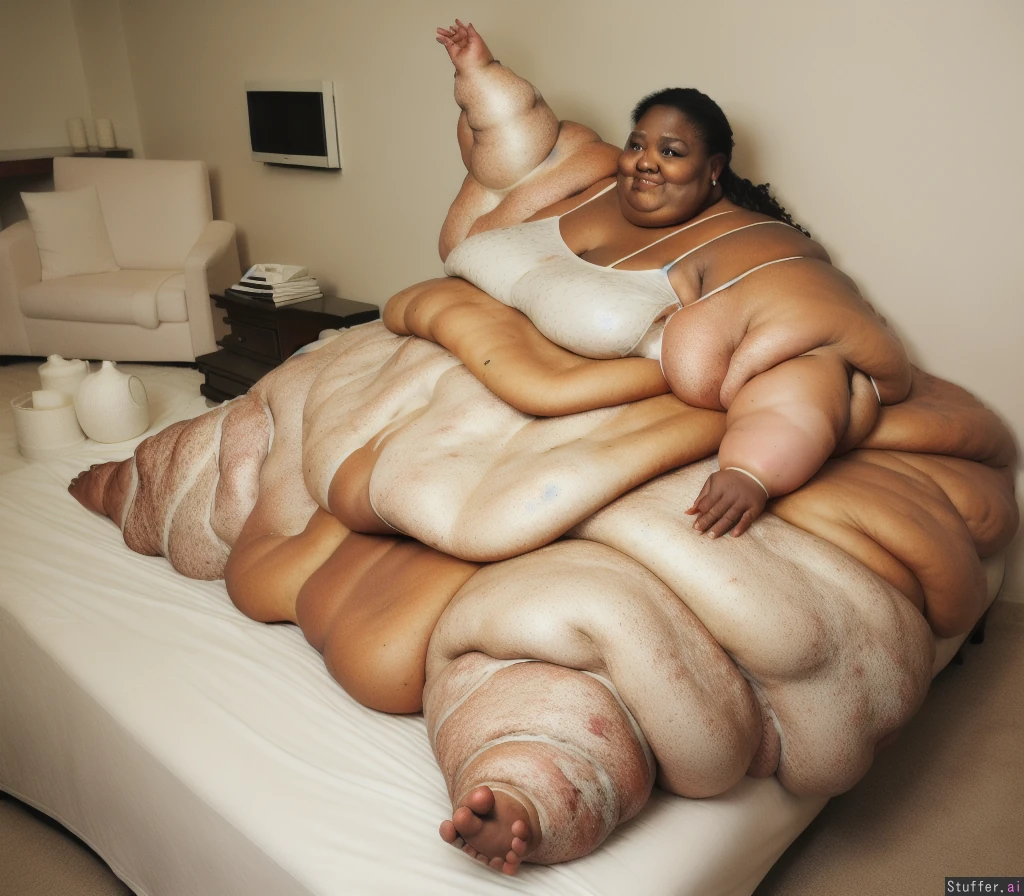 Photo realistic, ultra high quality, african ssbbw, beautiful face:1.4, (ultra double chin:1.9), (ultra fat face:1.9), (ultra huge legs:1.9), (ultra huge arms:1.9), (ultra leg rolls:1.7), bare feet:1.4, wearing a white bra, sitting on a bed,
