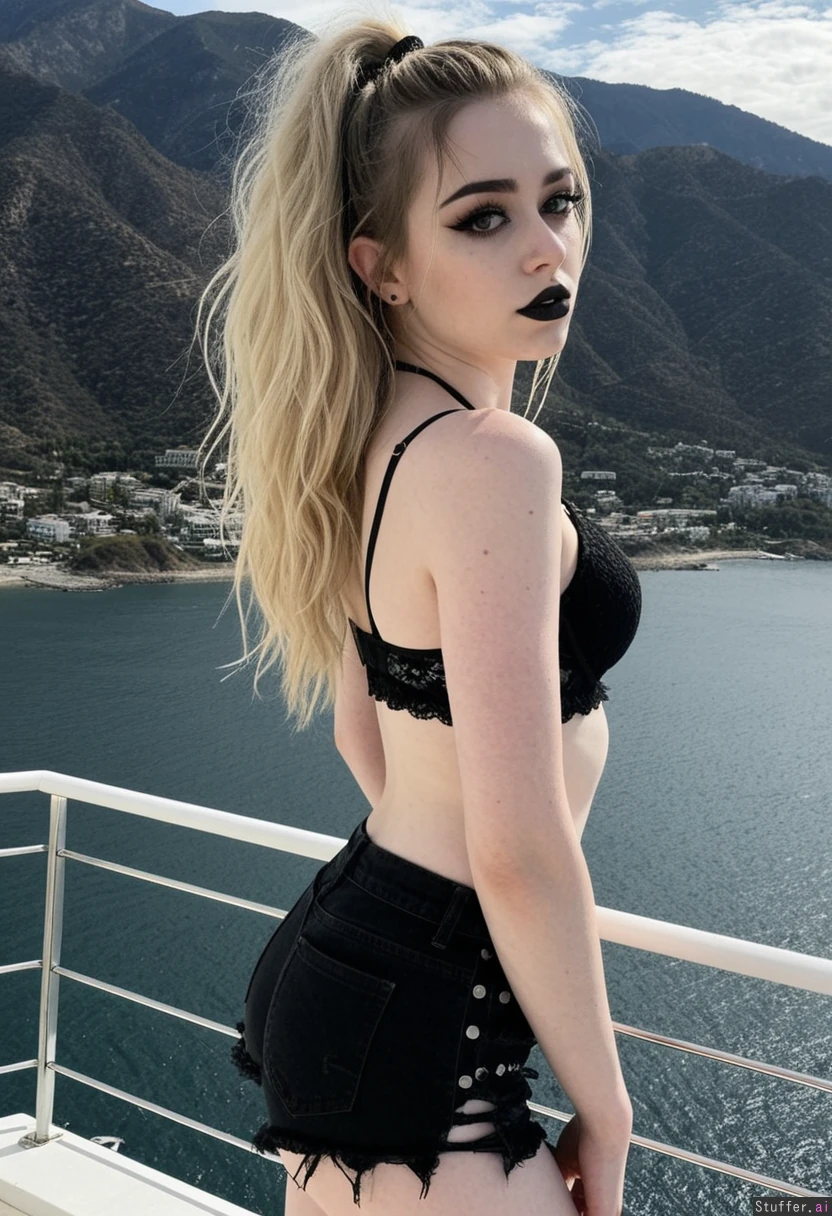 Masterpiece professional camera, wide-angle lens, natural lighting, perfect anatomy, center-left frame, noon lighting, Scene: A party yacht, Mountains in background, Subject: ((accurate Sabrina carpenter face)), slim thick, 20 years old, Sabrina carpenter, volumized tousled goth blonde hair, (3/4 body view), (lacey goth bikini top), (black gothic torn jean shorts), goth eyeliner, goth eyeshadow, goth makeup, bottom heavy, black lipstick, pale alabaster skin