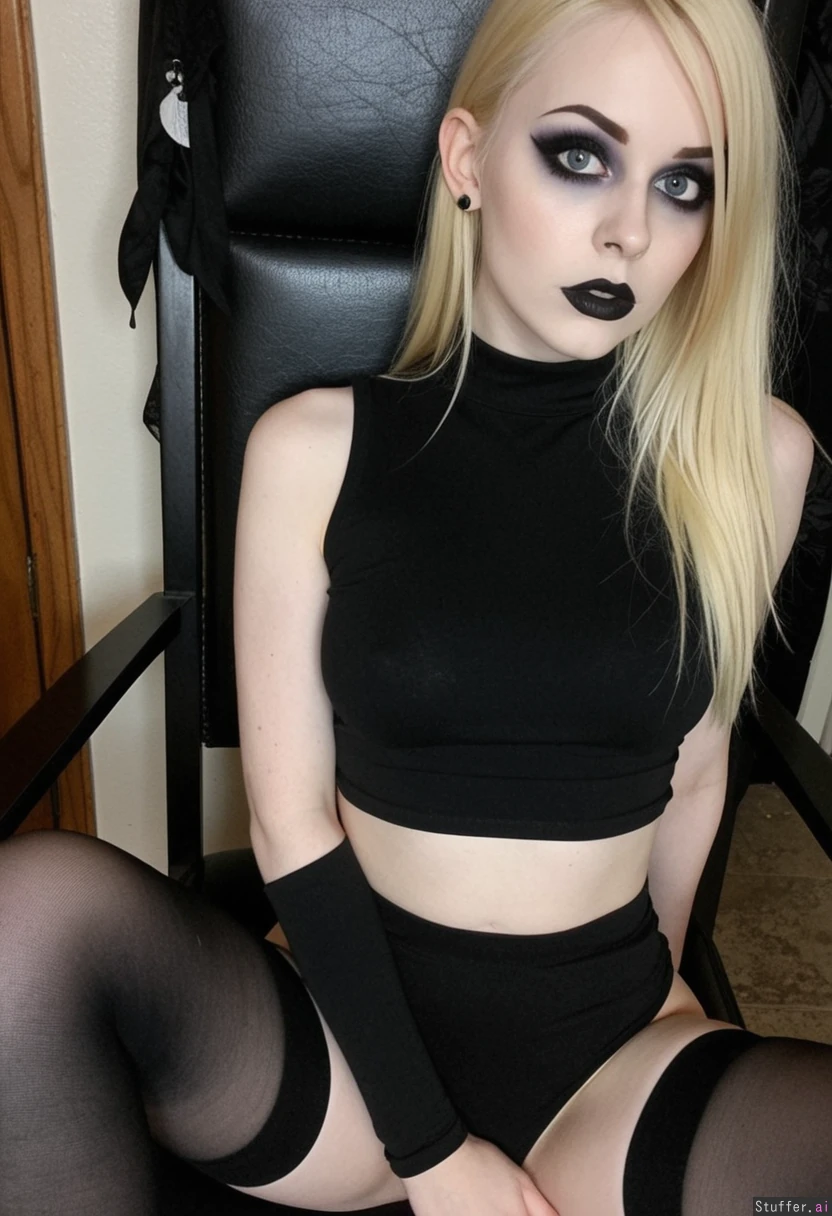 Pretty girl, black raven hair, blonde highlights, blue eyes, pale skin, makeup, Big eyes, goth crop top, black_legwear, sit on a chair, goth eyeliner, goth eyeshadow, goth makeup, pale alabaster skin
