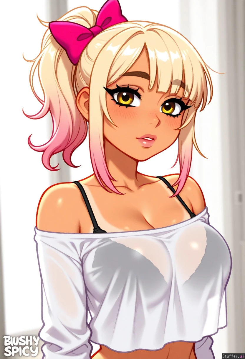 (solo,1girl,best quality, high rating, blushyspicy (artist) )), Tan_skin, blonde_hair, bimbo_lips, yellow_eyes , side_ponytail, pink_hair_bow, shirt_overhang, black_bra_straps