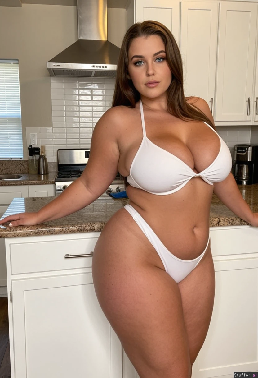 Tall tan woman standing in kitchen Brown hair, blue eyes Wearing white bikini Curvy body (Wide hips) (Curvy thick thighs) (Expanded hips)