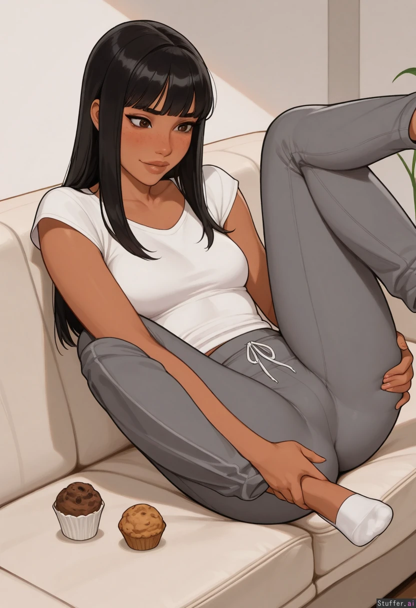 ((High quality Illustration, solo, 1 woman)), ((perfect proportions, perfect anatomy)), solo girl, (pewbutt(artist):1.5), (KAMII MOMORU(artist):1.1), (kittew(artist):1.0), (reiq(artist)), ((Brown skin, tomboy, adult woman, black straight hair, bangs, brown eyes, freckles, cheerful expression)) Laying on couch, lazy, hunched, (hands on thigh), ((lazy legs position)), (curling), Plain t shirt, grey sweatpants, shy, narrow_waist, small_breasts, (Chubby:0.30), (muffin_top)