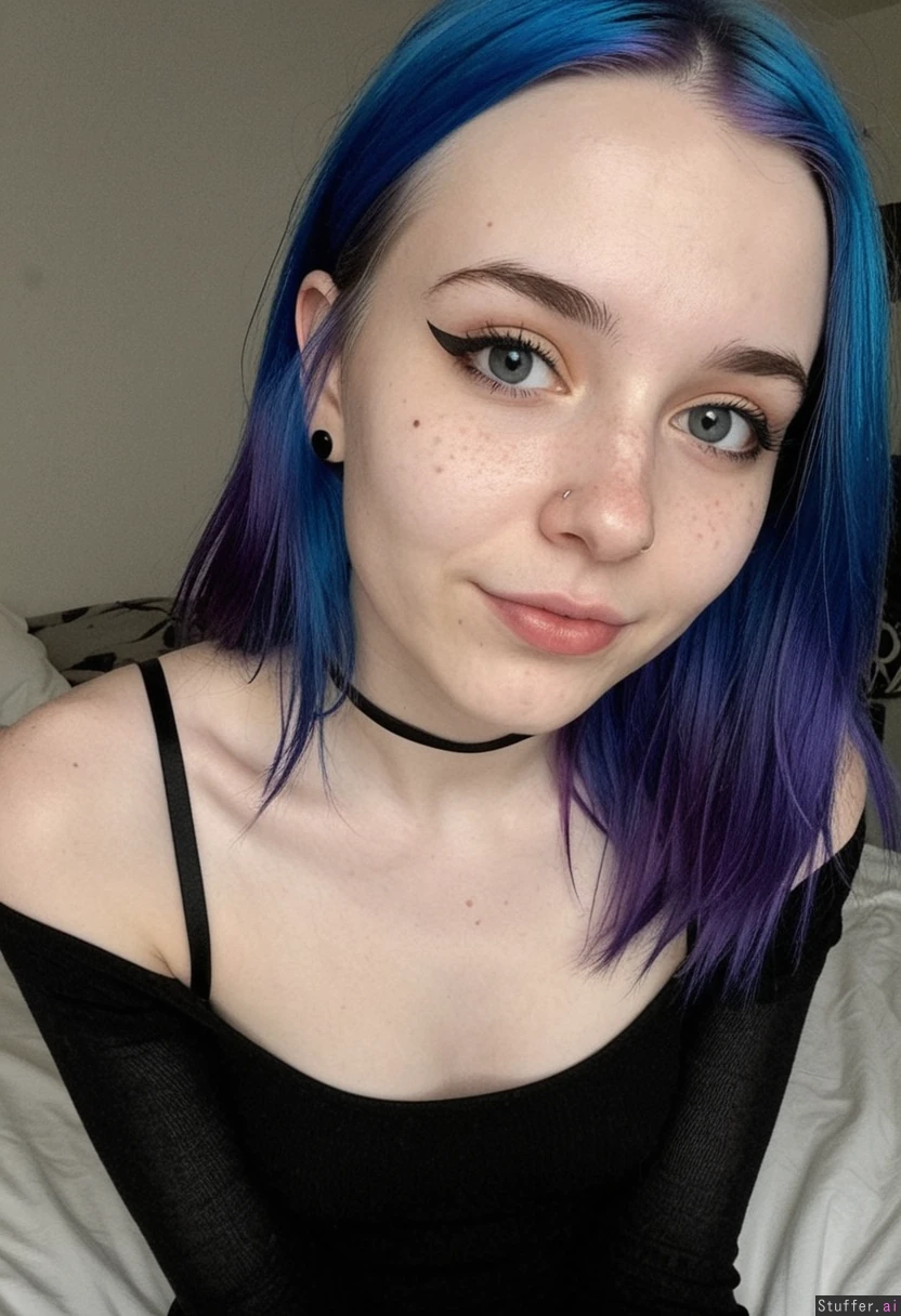 (20 year old girl with a vibrant radiance), (she is natural pretty and has a cute expression), (she has a few distinct moles), (unintentionally she rocks a simple goth style)(with blue and purple hair) Body: average She is sitting inside on her bed perfect light ambience.)