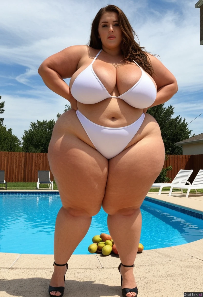 Curvy woman standing at pool Black high heels Blue eyes Brown hair Tan skin Black thong White outgrown bikini Large breasts cleavage showing (((Pear shaped body))) (((Hyper Massive wide hips))) (((Round massive thick curvy hips)))