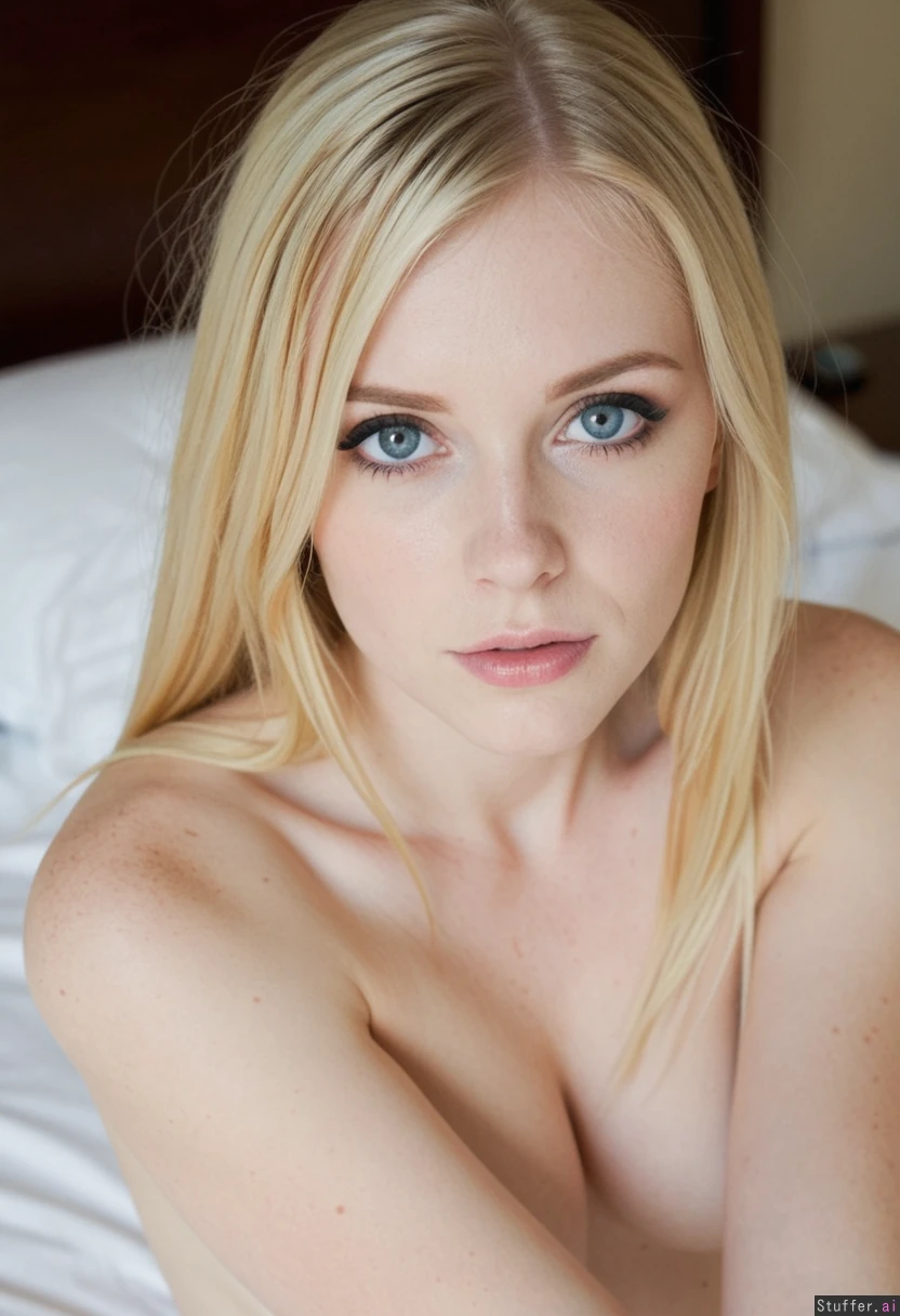 Pretty blonde girl , blue eyes, pale skin, makeup, beautiful eyes, Body: average She is sitting inside on her bed perfect light ambience.)