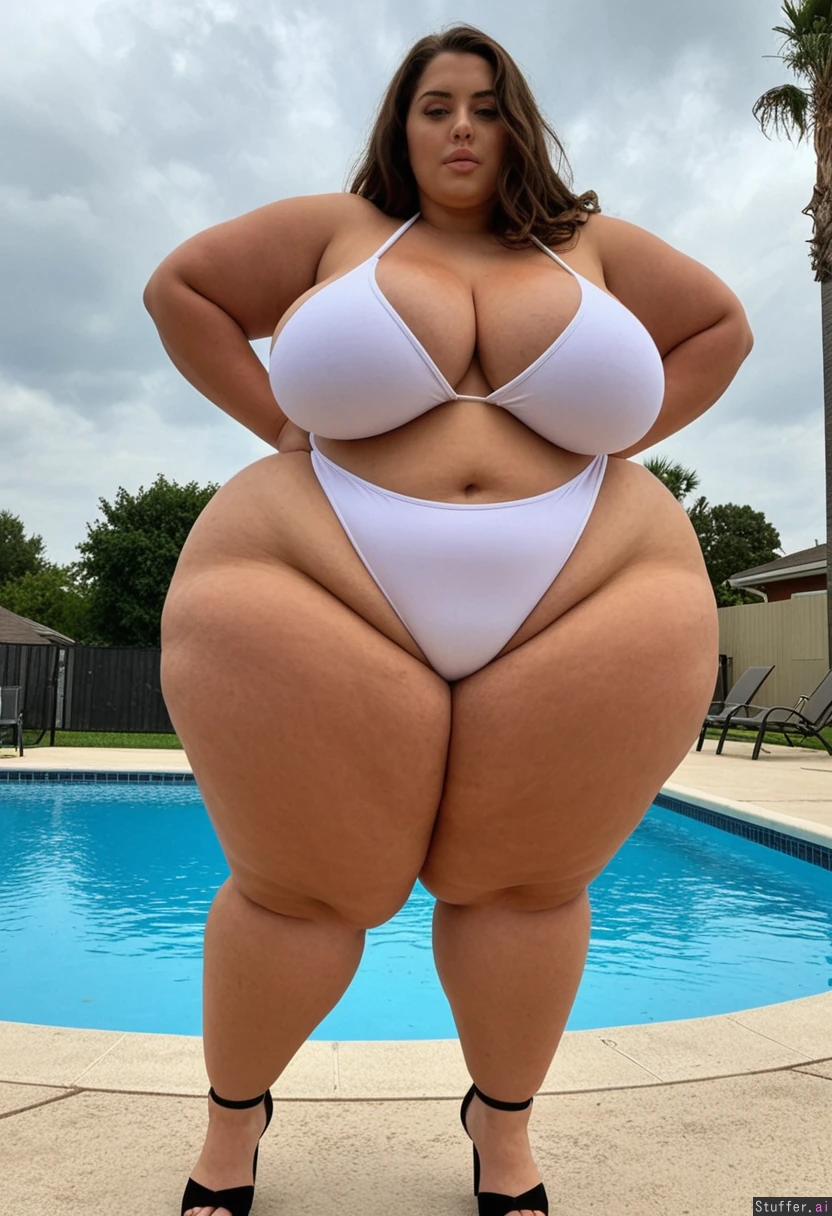 Curvy woman standing at pool Black high heels Blue eyes Brown hair Tan skin Black thong (White outgrown bikini) Large breasts cleavage showing ((Pear shaped body)) ((((Hyper Massive wide hips)))) ((((Round massive thick curvy hips)))) ((((Mega thick body))))