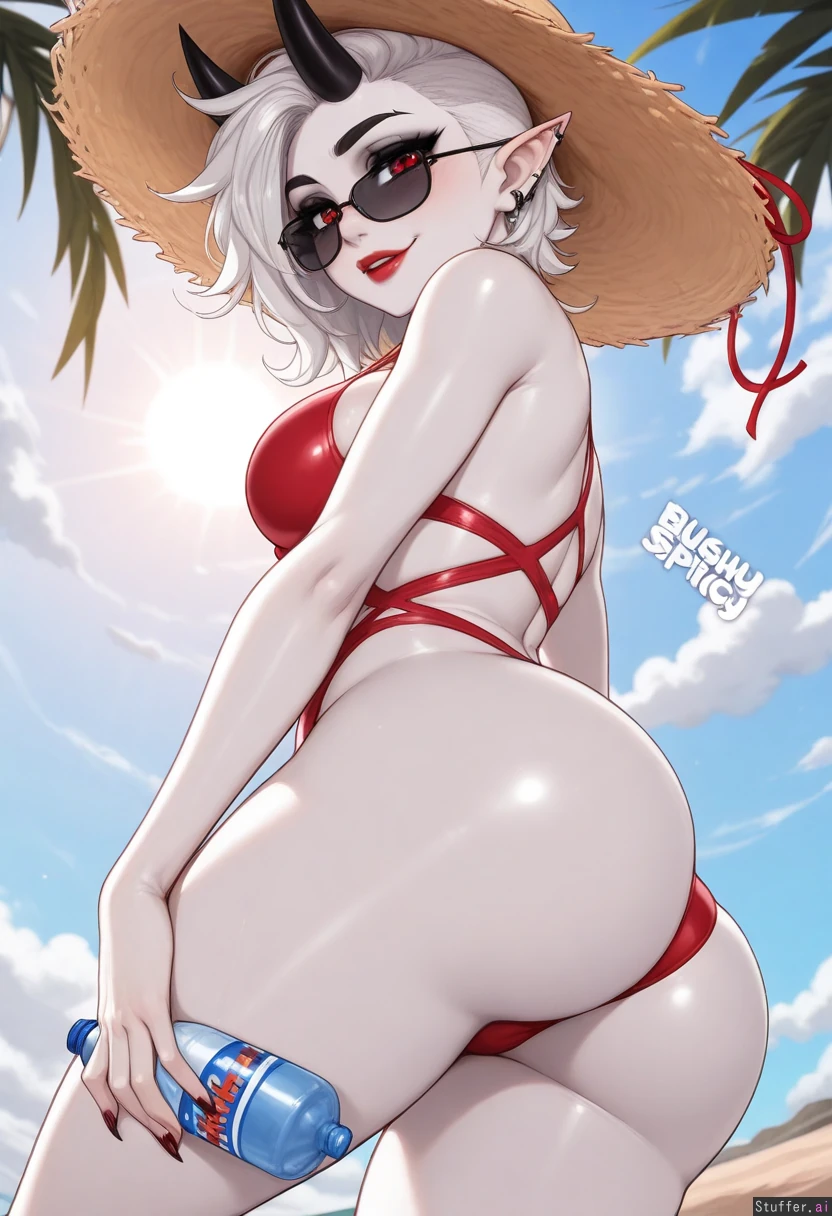 ((((solo,1girl,best quality, HDR, high rating, simple_shading, kittew (artist), blushyspicy (artist) )))), (((Pale_skin, White skin, red_eyes, white_hair, demon_girl, black_horns, hair_behind_ear, long_pointy_ears, earpiercing, no_tail, black_eyeshadow, red_lipstick, ((sidecut_hair)) )) ((Red_swimsuit, black_sharp_fingernails,)) (( Beach, side_view, low-angle_view, ass_visible_from_front, holding_1_water_bottle, sunlight, sun_hat, sunglasses, black_sunglasses))