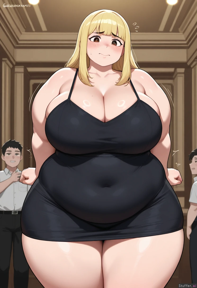 smooth shading, namiorii(artist), Krekkov(artist), KAMII MOMORU(artist), student, homecoming dance, gorgeous face, blonde, pretty hair, (Morbidly obese girl), fat face, double chin, fat neck, gigantic fat jiggly belly, love handles, massive thighs, fat arms, arm rolls, jiggling, cleavage, bouncing belly, fat bulging out of clothes, belly overhang, thick waist, cringing, embarrassed, mortified, shy, meek, passive, soft, clingy dress, clothes too small, clothes riding up, tugging on her clothes, public humiliation,