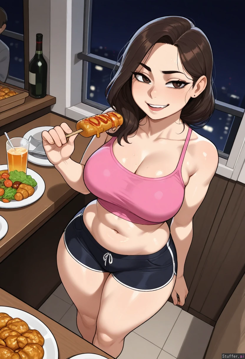 (Aesthetic angle, Perfect detail, flawless anatomy, 8k:1.1), (krekkov(artist), KAMII_MOMORU(artist)) (Beautiful brunette 26yo bimbo), (expressive brown eyes and detailed mature face), shoulder length dark brunette hair, mature adult body (Big belly:0.8), (spherical belly:0.6) (gorging herself with food and drinks:1.2) (fertile soft body, modest round breasts, round hips, shapely thighs and legs:1.2) (Flirty cocky expression, slutty openmouthed smirk:1.2) (Tight pink crop top tank top, tight black shorts:1.2) (Walking through house party, surrounded by food on tables, late at night, distracted by food)