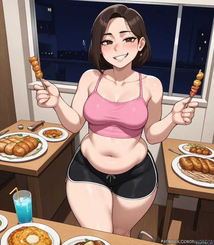 (Aesthetic angle, Perfect detail, flawless anatomy, 8k:1.1), (krekkov(artist), KAMII_MOMORU(artist)) (Beautiful brunette 26yo bimbo), (expressive brown eyes and detailed mature face), shoulder length dark brunette hair, mature adult body, (slight blush) (bloated belly:1.1), (spherical belly:0.9) (gorging herself with food and drinks:1.2) (fertile soft body, modest round breasts, round hips, shapely thighs and legs:1.2) (Flirty cocky expression, slutty openmouthed smirk:1.2) (Tight pink crop top tank top, tight black shorts:1.2) (Walking through house party, surrounded by food on tables, late at night, distracted by food)