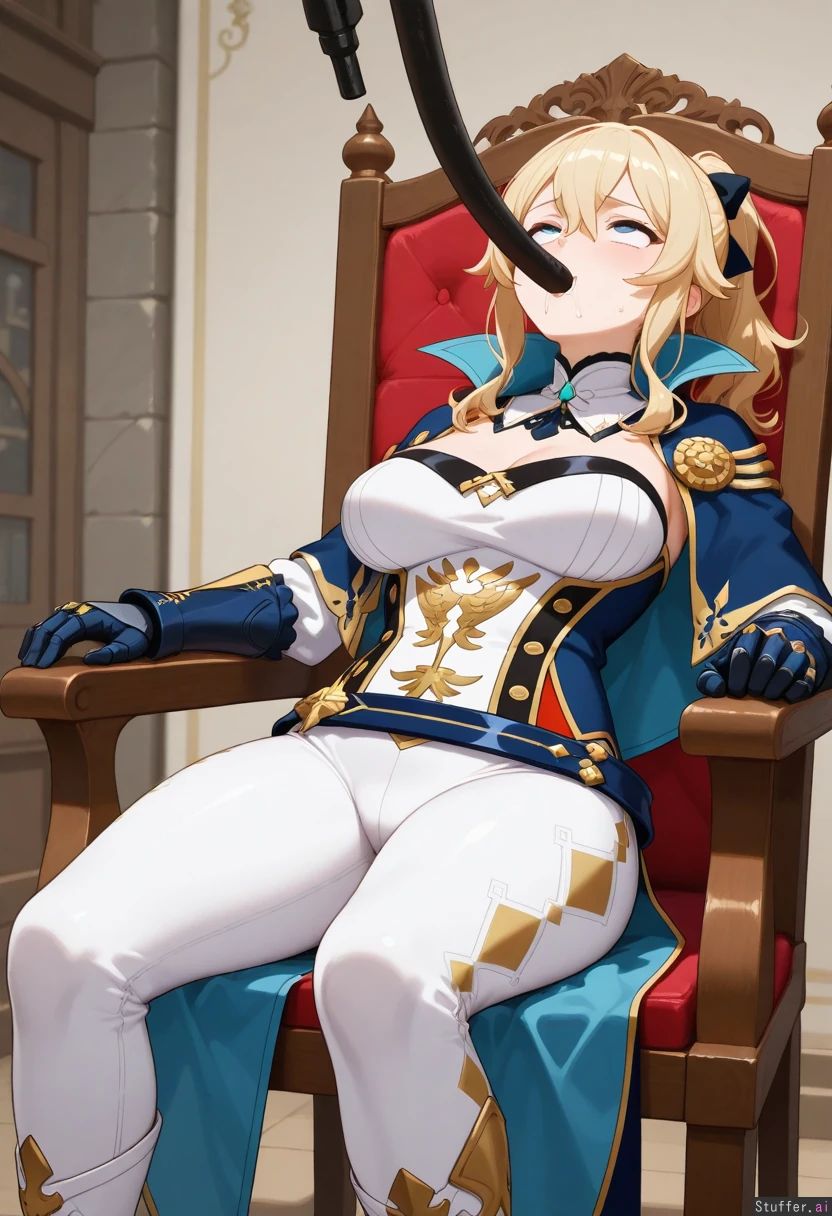 sitting in a chair, leaning back, black hose in mouth, force feeding, chewing, looking up, (ahegao), fully clothed, (fully covered fat belly, fat breasts, fat thighs:0.6)