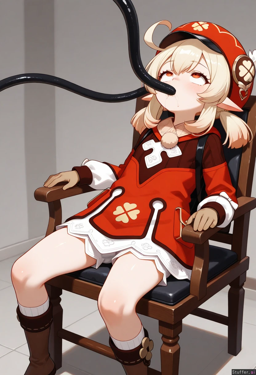 1girl, solo, Klee from Genshin Impact, sitting in a chair, leaning back, black hose in mouth, force feeding, chewing, looking up, (ahegao), fully clothed, (fully covered fat belly, fat breasts, fat thighs:0.5)