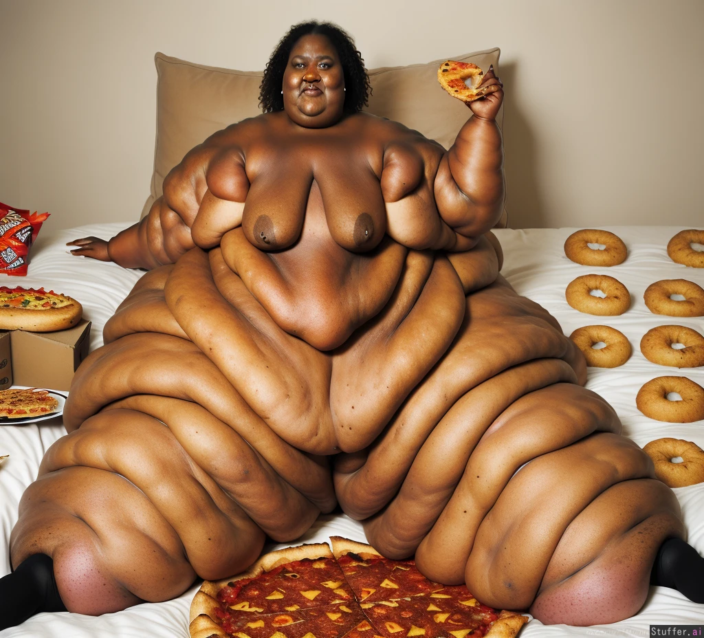 Photo realistic, ultra high quality, african ssbbw, beautiful face:1.4, (ultra double chin:1.9), (ultra fat face:1.9), (ultra huge legs:1.9), (ultra huge arms:1.9), (ultra leg rolls:1.7), black socks:1.4, naked, sitting on a bed, surounded by dounts, pizza, cake, and doritos bags