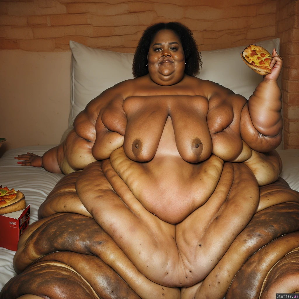 Photo realistic, ultra high quality, african ssbbw, beautiful face:1.4, (ultra double chin:1.9), (ultra fat face:1.9), (ultra huge legs:1.9), (ultra huge arms:1.9), (ultra leg rolls:1.7), black socks:1.4, naked, sitting on a bed, surounded by dounts, pizza, cake, and doritos bags