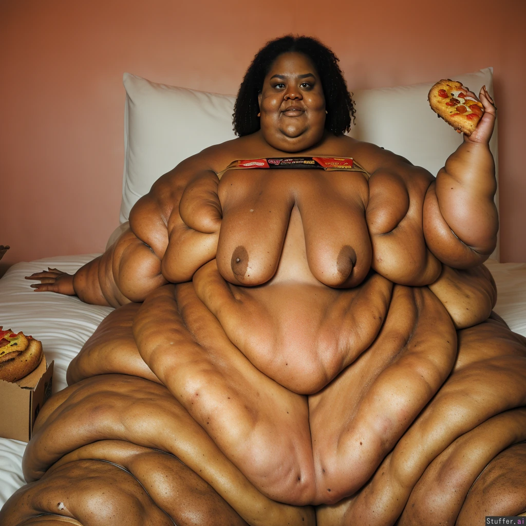 Photo realistic, ultra high quality, african ssbbw, beautiful face:1.4, (ultra double chin:1.9), (ultra fat face:1.9), (ultra huge legs:1.9), (ultra huge arms:1.9), (ultra leg rolls:1.7), black socks:1.4, naked, sitting on a bed, surounded by dounts, pizza, cake, and doritos bags
