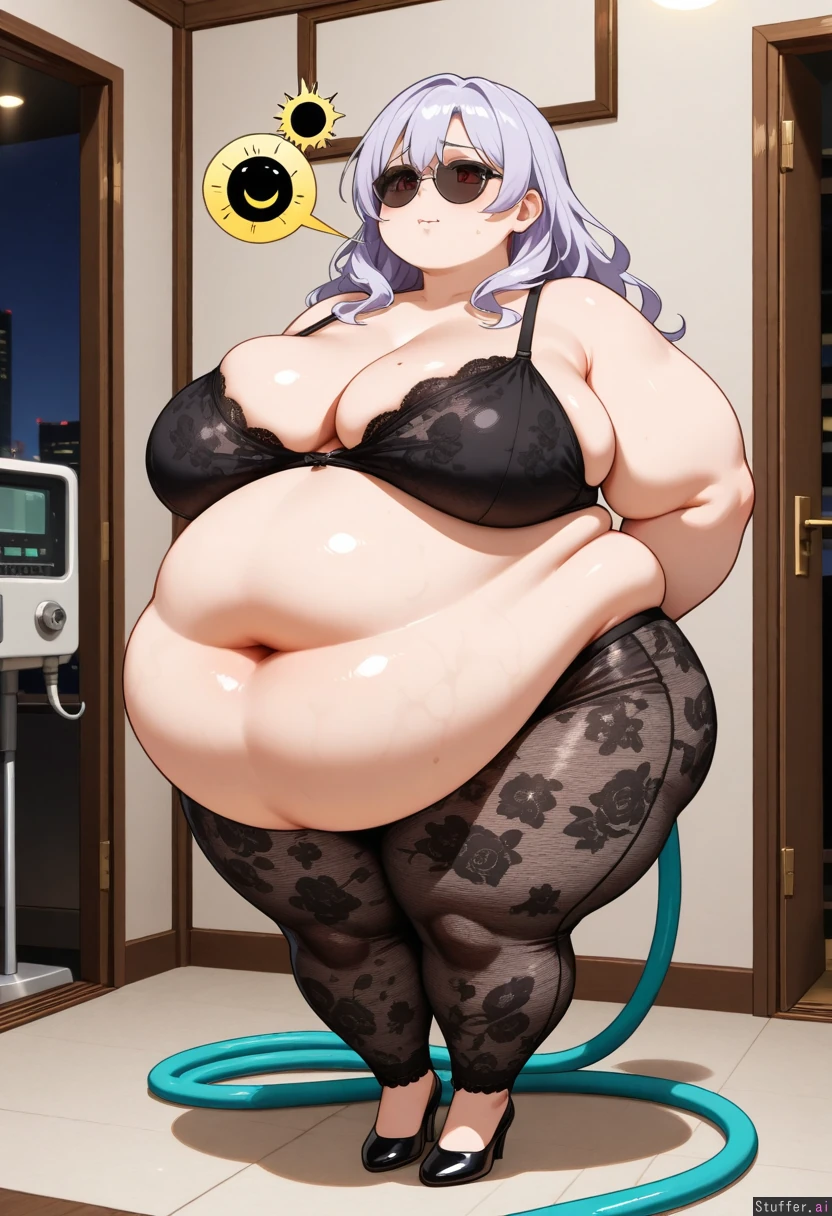 1girl, Cute girl, long wavy light purple hair, red eyes, mature, (tall:1.1), extremely exhausted , chubby face, hands behind back, breasts together, Black full body lace suit, lace stripes on waist, black sun glasses, (Fat arms:1.4), (Fat breasts:1.8), (Fat spherical belly:1.7) (Fat waist:1.4), (Fat hips:1.4), Full height, Wide Hose of feeding machine connects to top of belly, Chinese hotel, detailed_background