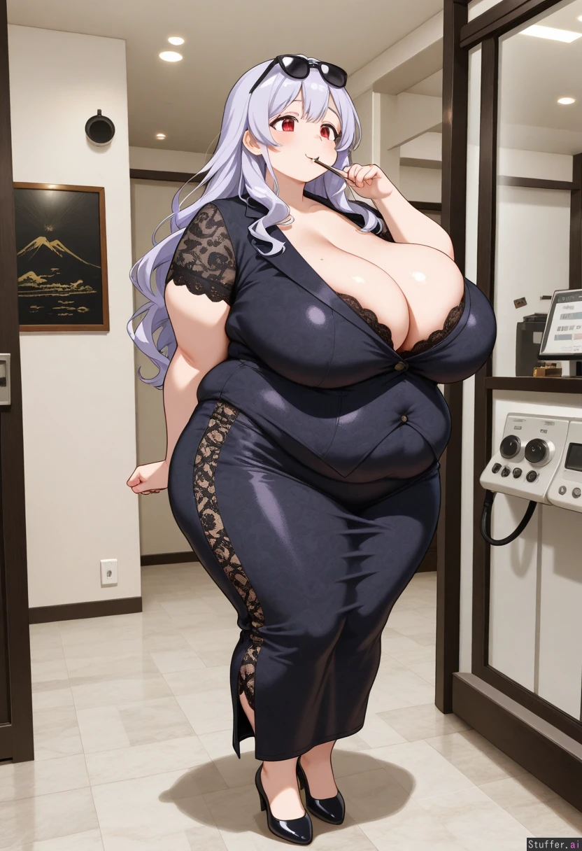 1girl, Cute girl, long wavy light purple hair, red eyes, mature, (tall:1.1), chubby face, hands behind back, breasts together, Black full body lace suit, lace stripes on waist, black sun glasses, (Fat arms:1.1), (Fat breasts:1.8), (Fat spherical belly:0.5) (Fat waist:1.1), (Fat hips:1.1), Full height, feeding machine connected to mouth, Chinese hotel, detailed_background