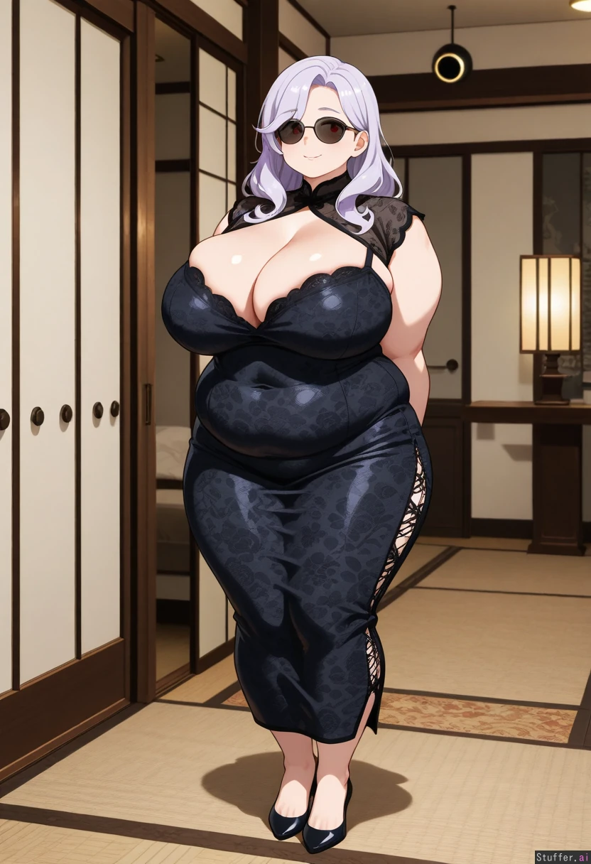 1girl, Cute girl, long wavy light purple hair, red eyes, mature, (tall:1.1), chubby face, hands behind back, breasts together, Black full body lace suit, lace stripes on waist, black sun glasses, (Fat arms:1.1), (Fat breasts:1.3), (Fat spherical belly:0.5) (Fat waist:0.5), (Fat hips:0.6), Full height, Standing, Chinese hotel, detailed_background