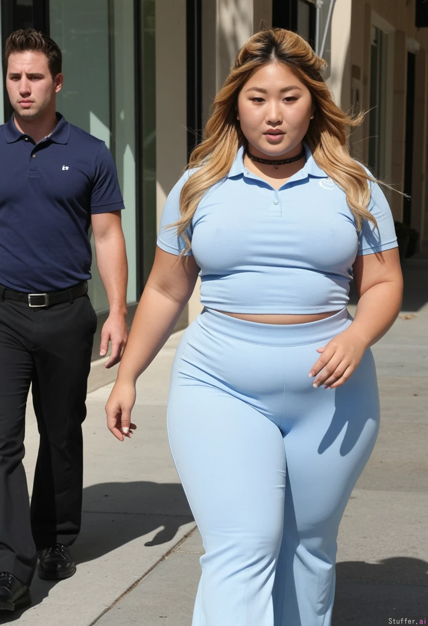 High resolution photo, film grain, exceptional detail, Perfect anatomy, stunning gorgeous Chloe kim, ((Chloe Kim)), (((Chloe Kim face))), formal snowboarder, tousled hair, dyed blonde hair, tan skin, choker, (high waisted office palazzo pants), pastel blue tight fitting polo shirt, big belly (wide hips and big thick thighs)) ((strutting down a sidewalk)) , (big bloated belly),