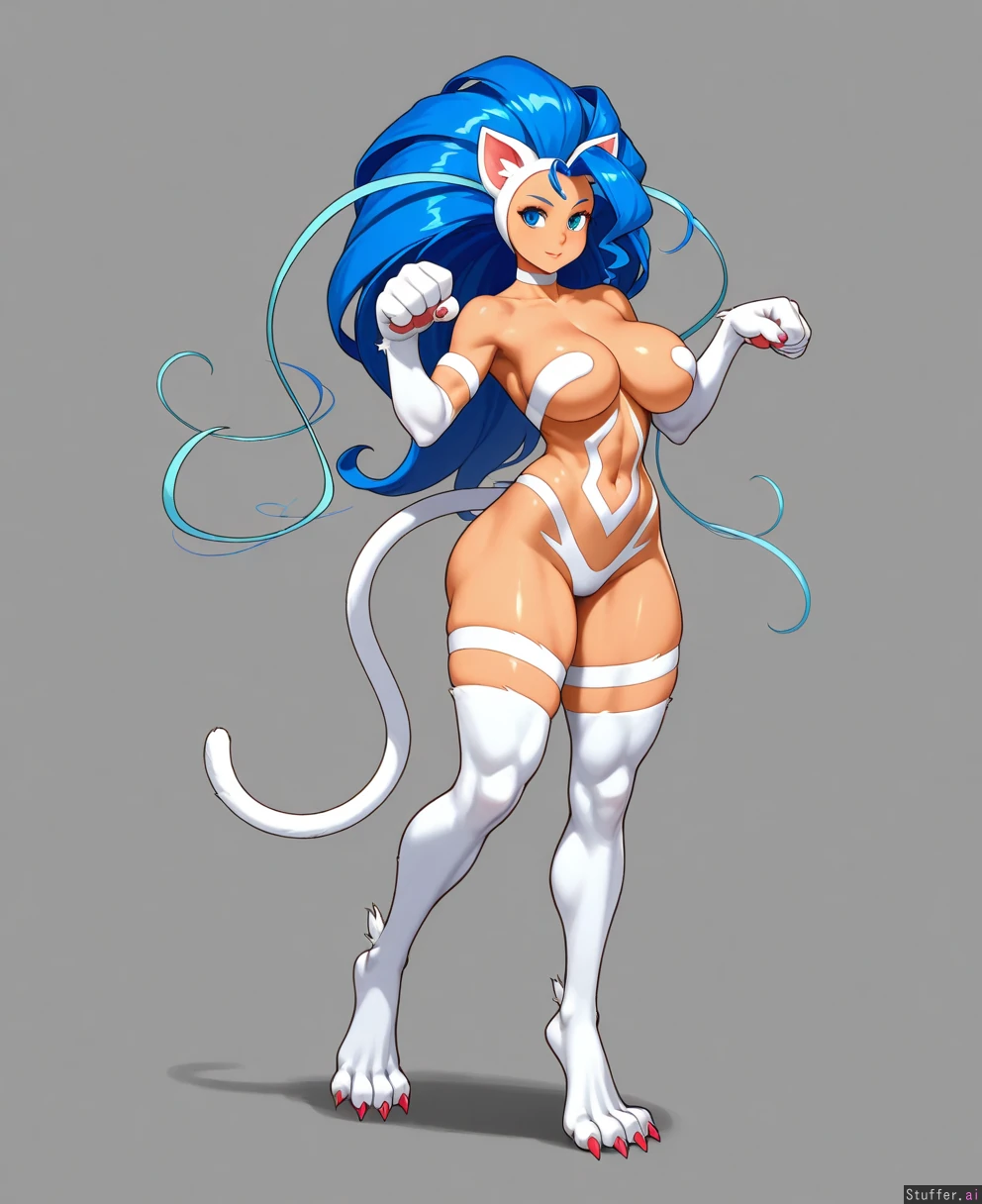 8k, uhd, best quality, high rating, highres, anatomically correct, perfect anatomy, flawless, detailed face, simple background, simple shading, (cell shading), felicia(darkstalkers), female, human, cat girl, blue hair, cat paws, digitigrade, solo, alone, toned female, big breasts, cleavage, wide hips, thick thighs, sexy, cute, sexy pose, posing,