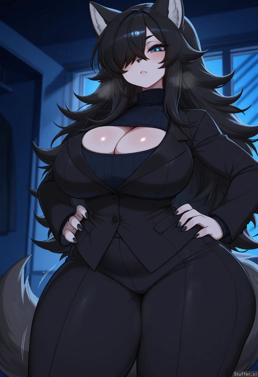 masterpiece, best quality, amazing quality, merunyaa, usa37107692, nighttime, dark room, 1girl, solo, standing, ((wolf anthro girl)), dark gray fur, white belly, long messy hair, long messy black hair, blue eyes, seductive stare at viewer, hair over eyes, horny, nose piercing, (thigh expansion: 1.2), heavy breathing, (black business suit), (black blazer, navy blue undershirt) (large breasts: 1.6), cleavage, saggy breasts, massive breasts, massive thighs, massive belly, ((bottom heavy)), hands on hips, ((fat body)), extremely bottom heavy, ((massive cleavage)), large breasts, ((bottom heavy:1.6)), massive ass, large ass, (very overweight), navy blue turtle neck, breasts pressing against shirt