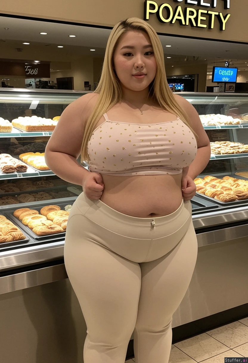 25 year old beautiful Korean girl, hair dyed with blonde highlights (((summer top and pants)))navel piercing (((Wide hips))) Plump SSBBW Huge fat blob fat_belly Full body view Beautiful lighting Standing in mall (Next to pastry case, holding pastry)