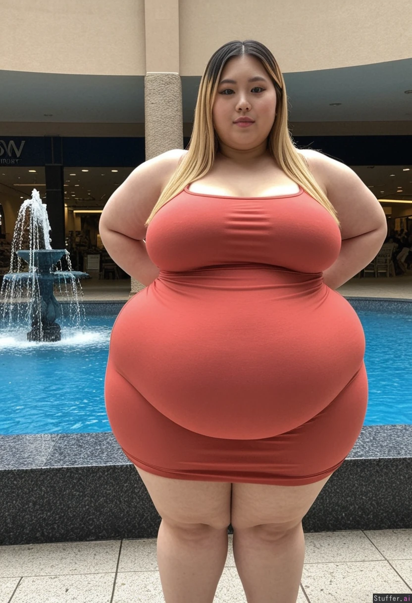 25 year old beautiful Korean girl, hair dyed with blonde highlights (((wearing big stretchy summer dress)))