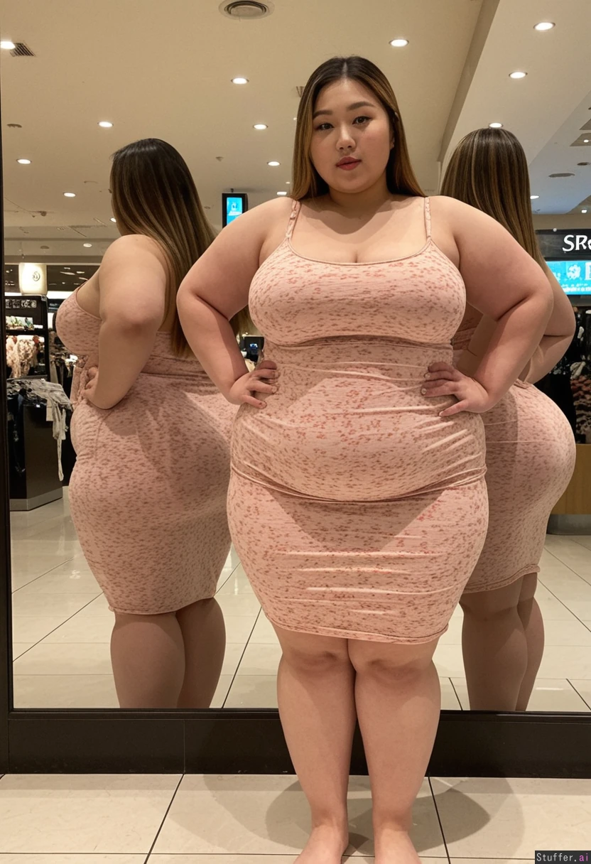 25 year old beautiful Korean girl, hair dyed with blonde highlights (((wearing big stretchy summer dress))) (((Wide hips))) Plump (Fat_belly) Overweight BBW Full body view Beautiful lighting Standing in mall, in front of mirror