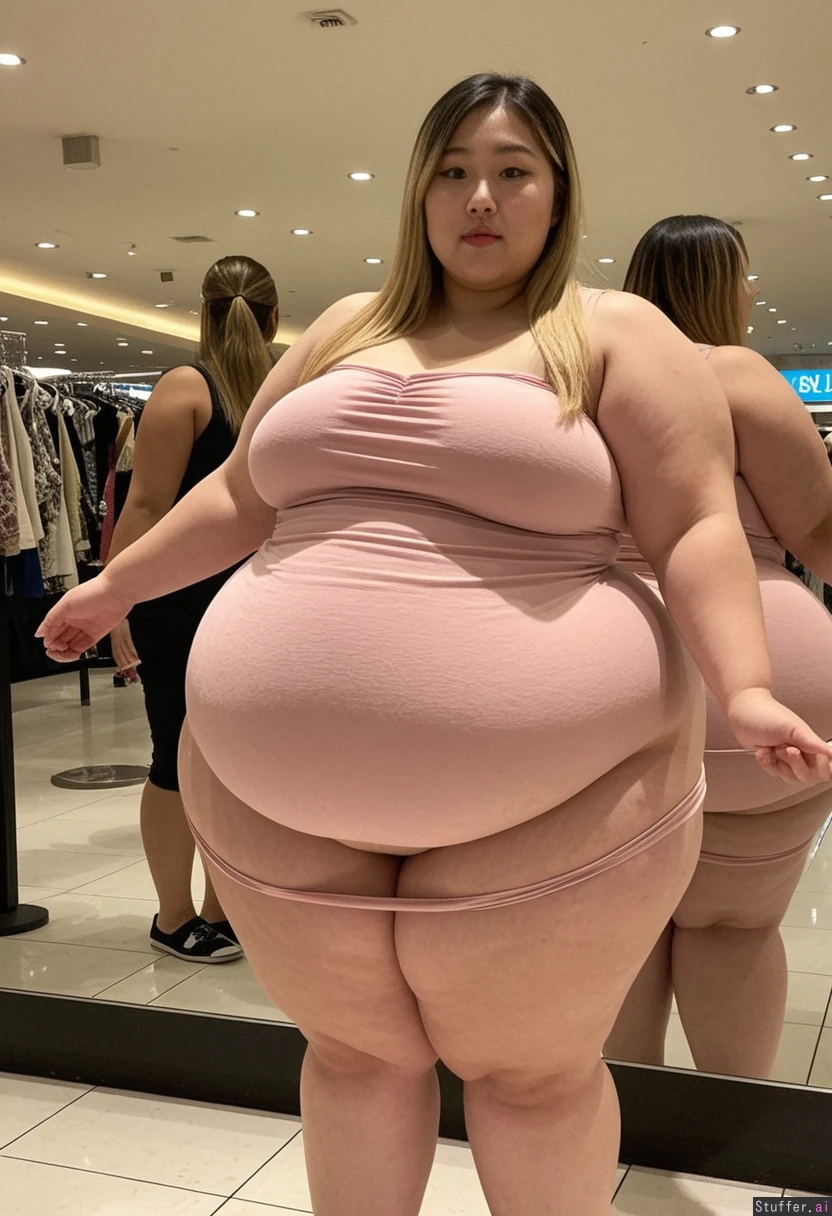25 year old beautiful Korean girl, hair dyed with blonde highlights (((wearing big stretchy summer dress))) (((Wide hips))) Plump (Fat_belly) Overweight (((Huge fat blob))) Bottom heavy Full body view Beautiful lighting Standing in mall, in front of mirror