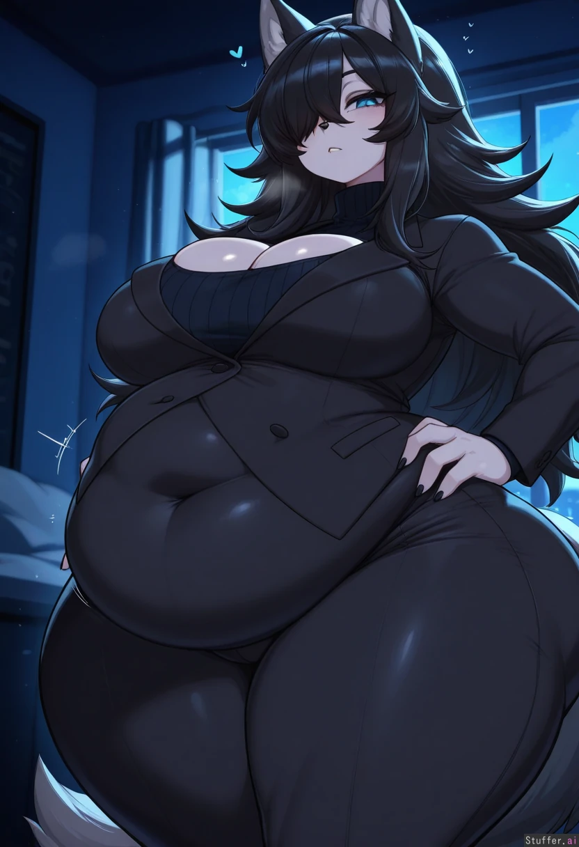 masterpiece, best quality, amazing quality, merunyaa, usa37107692, nighttime, dark room, 1girl, solo, standing, ((wolf anthro girl)), dark gray fur, white belly, long messy hair, long messy black hair, blue eyes, hair over eyes, horny, seductive stare at viewer, nose piercing, (thigh expansion: 1.2), heavy breathing, (black business suit), (black blazer, navy blue undershirt), navy blue turtle neck, (large breasts: 1.6), cleavage, saggy breasts, massive breasts, massive thighs, massive belly, ((bottom heavy)), hands on hips, ((fat body)), extremely bottom heavy, ((massive cleavage)), large breasts, ((bottom heavy:1.6)), massive ass, large ass, hyper hips, wide hips, wide ass, (very overweight), (hyper wide hips:1.6), (hyper hips), ((obese: 1.7)), ((super overweight)), ((weight gain:1.6)), ((muffin top)), ((belly fully covered:2.0)), covered belly