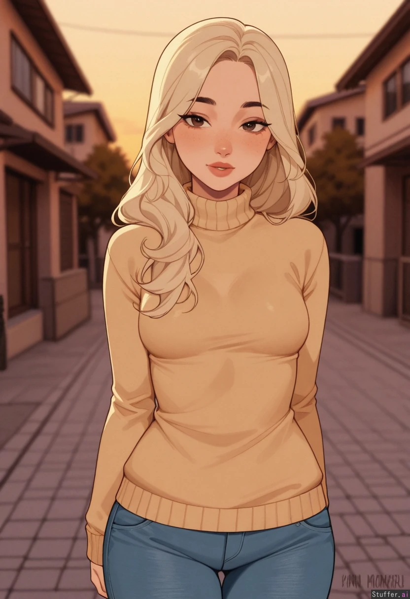 high quality, (masterpiece), (warm colors), evening, kamii momoru(artist), (semi-realistic human anatomy), (model beauty face), (seductive face expression), 1woman, adult, mature, blurry background, view from behind walking to house, (small breasts), Long blonde hair (covered by sweater and jeans), (Chubby:0.60)