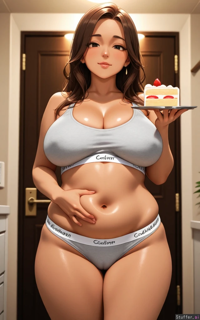 POV: Your extremely hot girlfriend wants to become a BBW and is fattening up before your own eyes. Girlfriend: Ultra hot Italian supermodel. Long brunette hair. Soft and Curvy. Tanned skin. Wearing tight grey Calvin Klein underwear . Eating cake. Standing up. Grabbing belly. Mature. Over fed. Overweight . Round heavy belly. Fat jiggly hips (Cinematic lighting) (Masterpiece) (Photorealistic)