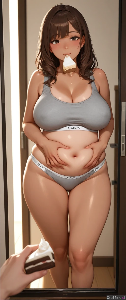 POV: Your extremely hot girlfriend wants to become a BBW and is fattening up before your own eyes. Girlfriend: Ultra hot american supermodel. Long brunette hair. Soft and Curvy. Tanned skin. Wearing tight grey Calvin Klein underwear . Eating cake. Standing up. Grabbing belly. Mature. 26 years old. Over fed. Overweight . Round heavy belly. Fat jiggly hips, massive fat ass (Cinematic lighting) (Masterpiece) (Photorealistic)