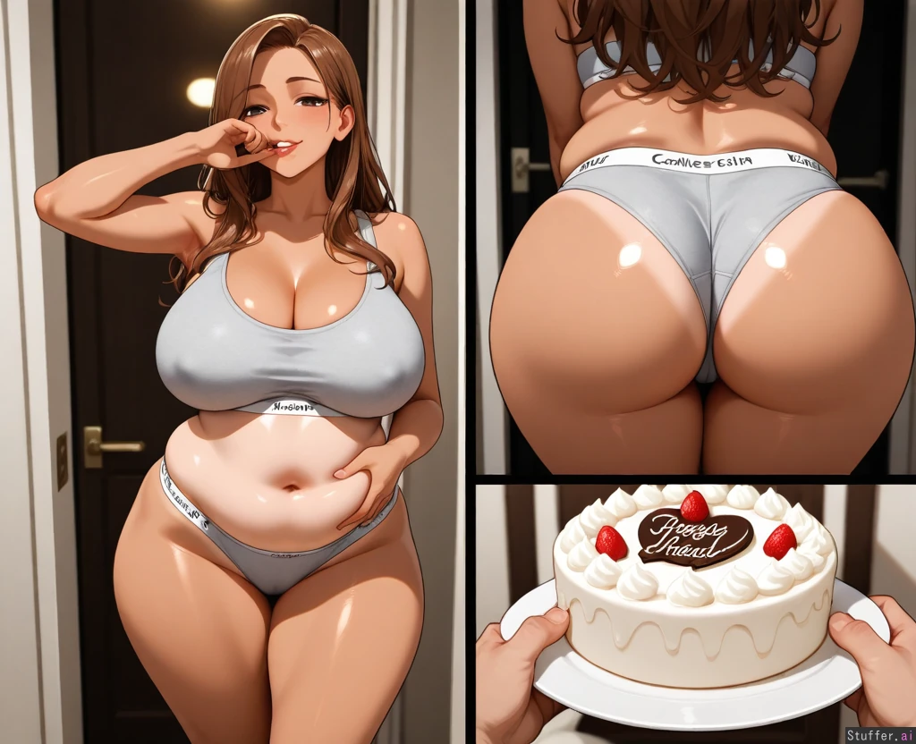 POV: Your extremely hot girlfriend wants to become a BBW and is fattening up before your own eyes. Girlfriend: Ultra hot sexy american supermodel. Long brunette hair. Soft and Curvy. Tanned skin. Wearing tight grey Calvin Klein underwear . Eating cake. Standing up. Grabbing belly. Mature. 26 years old. Over fed. Overweight . Round heavy belly. Fat jiggly hips, massive fat ass (semi-realistic anatomy) (Cinematic lighting) (Masterpiece) (Realistic ) (Goddess)