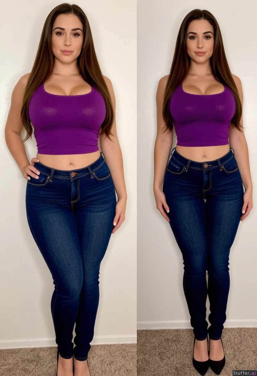 Tall woman Curvy body Hourglass figure Slim waist Extremely wide hips Tight jeans Purple tank top Long brown hair