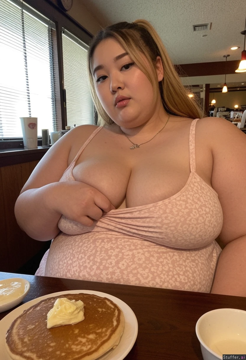 beautiful 20 year old Korean girl, full lips, high cheekbones, hair dyed with blonde highlights, necklace, (((wearing big stretchy summer dress))) sitting in diner Beautiful cinematic lighting Plump Overweight Obese SSBBW Huge fat blob (Fat_belly) Plump fat arms resting on table Big plate of pancakes and other food in front of her on table