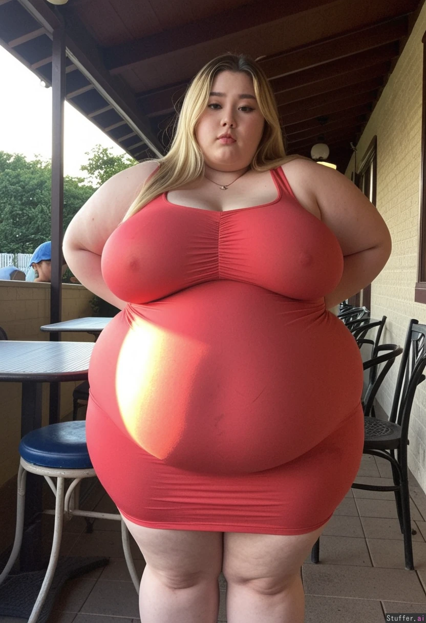 beautiful 20 year old Korean girl, full lips, high cheekbones, hair dyed with blonde highlights, necklace, (((wearing big stretchy summer dress))) standing in diner patio Beautiful cinematic lighting Plump Overweight Obese SSBBW Huge fat blob (Fat_belly) Plump fat arms Full body view (((Wide hips)))