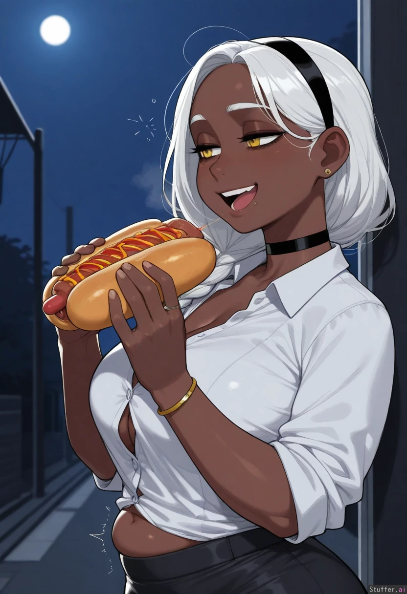 (highly detailed, best quality), (perfect anatomy, KAMII MOMORU (artist), blushspicy, krekkov), one girl, solo (( ((very_dark_skin)), yellow_eyes, braided_hair, white hair, hair_over_shoulder, office_lady office_shirt, white_shirt, black_skirt, medium_skirt, black_hairband, ear_ring, choker)) (( Walking, side_view, bored, tired, half_closed_eyes, ((full_body)), left_view, smiling, rumbling_stomach, eating, holding_hot_dog, open_mouth)) (( Dark_lighting, moonlight, night)) (( Chubby_belly:1.2)) (( thick_thighs:0.5)) (( large_breasts:0.4)), button_gap, street