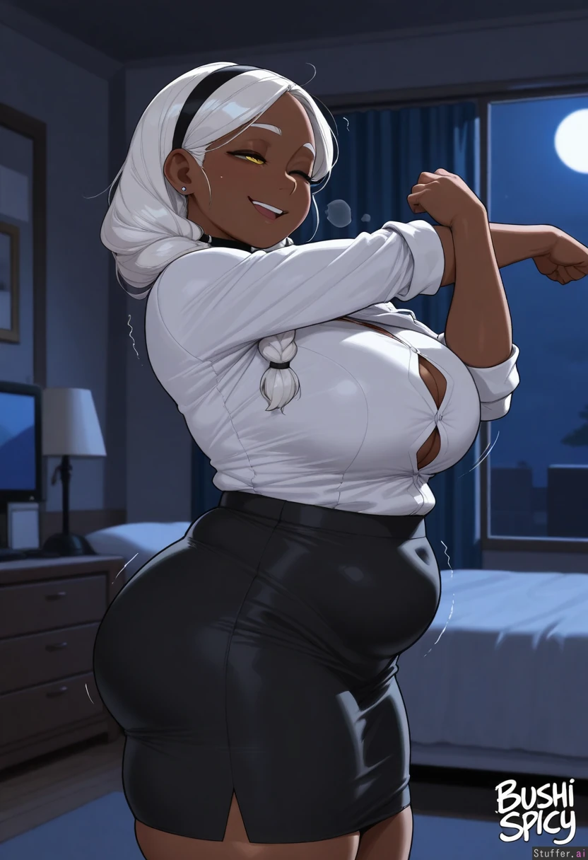(highly detailed, best quality), (perfect anatomy, KAMII MOMORU (artist), blushspicy, krekkov), one girl, solo (( ((very_dark_skin)), yellow_eyes, braided_hair, white hair, hair_over_shoulder, office_lady office_shirt, white_shirt, black_skirt, medium_skirt, black_hairband, ear_ring, choker)) ((Back_view, bored, tired, half_closed_eyes, ((full_body)), left_view, smiling, rumbling_stomach)) (( Dark_lighting, moonlight, night)) (( Chubby_belly:1.3)) (( thick_thighs:0.5)) (( large_breasts:0.4)), ((button_gap, living_room, stretching, open_mouth, one_eye_closed, ass_visible_from_front, standing))