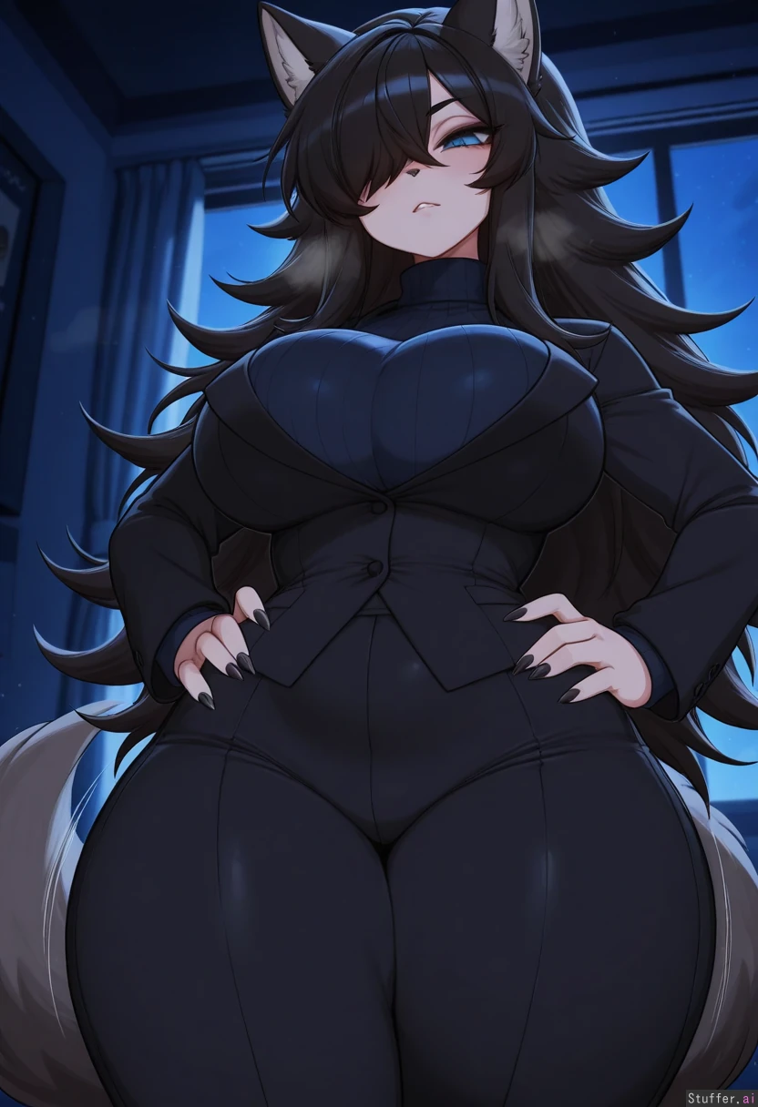 masterpiece, best quality, amazing quality, merunyaa, usa37107692, nighttime, dark room, 1girl, solo, standing, ((wolf anthro girl)), dark gray fur, long messy hair, long messy black hair, blue eyes, seductive stare at viewer, hair over eyes, horny, nose piercing, (thigh expansion: 1.2), heavy breathing, (black business suit), (black blazer, navy blue undershirt) (large breasts: 1.6), massive thighs, toned belly ((bottom heavy)), hands on hips, extremely bottom heavy, ((massive cleavage)), large breasts, ((bottom heavy:1.4)), navy blue turtle neck,