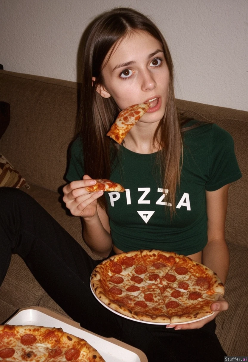 High resolution photo, film grain, exceptional detail, (skinny 0.9), 19 year old girl, straight brunette hair, super attractive model face, asking, worried, Wearing a dark green t-shirt, black pants, sit in the sofa, eat a tons of pizza, feeding herself with slice of pizza,