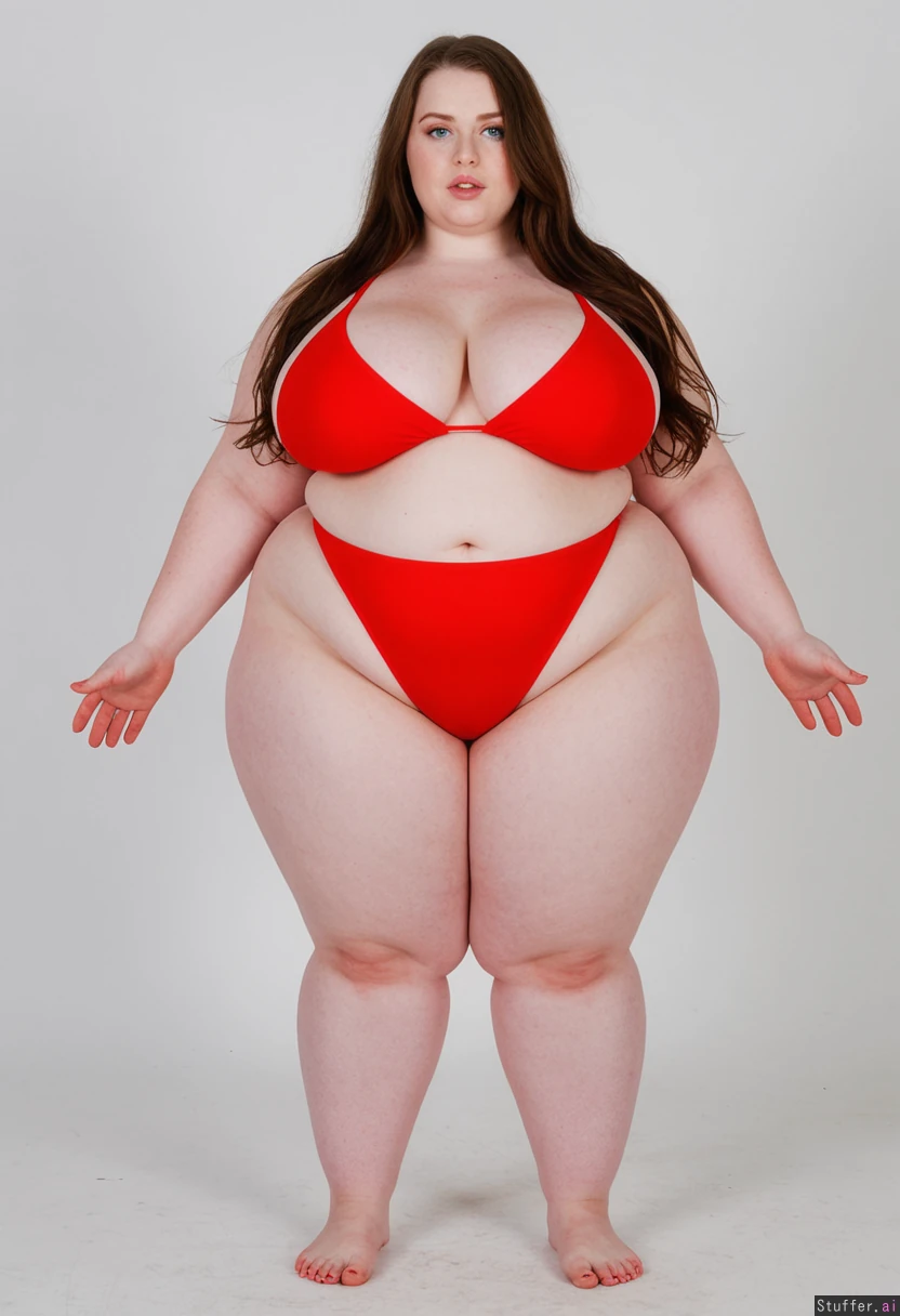 solo girl, long brown hair, blue eyes, pale skin, wearing red bikini, bare feet (hyper oversized full figure:1.7)