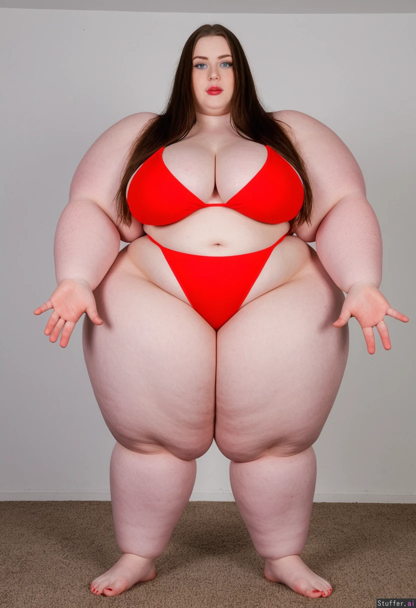 solo girl, long brown hair, blue eyes, pale skin, wearing red bikini, bare feet (hyper oversized gigantic figure:1.7)