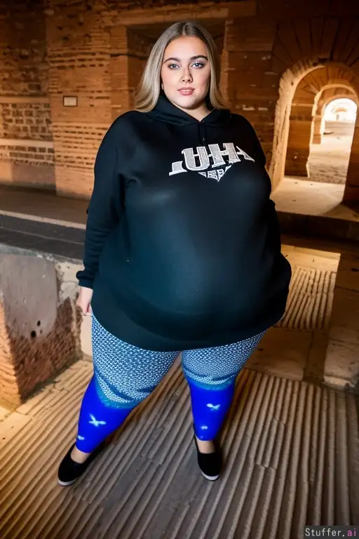 photo, 8k uhd ultra detailed, 1girl, college girl, age 20, young face, ssbbw, obese, huge butt, standing, fully clothed, leggins, long sweatshirt that covers whole torso, fat, gigantic gut, thick gut, bimbo, young, makeup, glamourous, skinny face, beautiful, gorgeous, attractive, setting is inside the colosseum in rome,