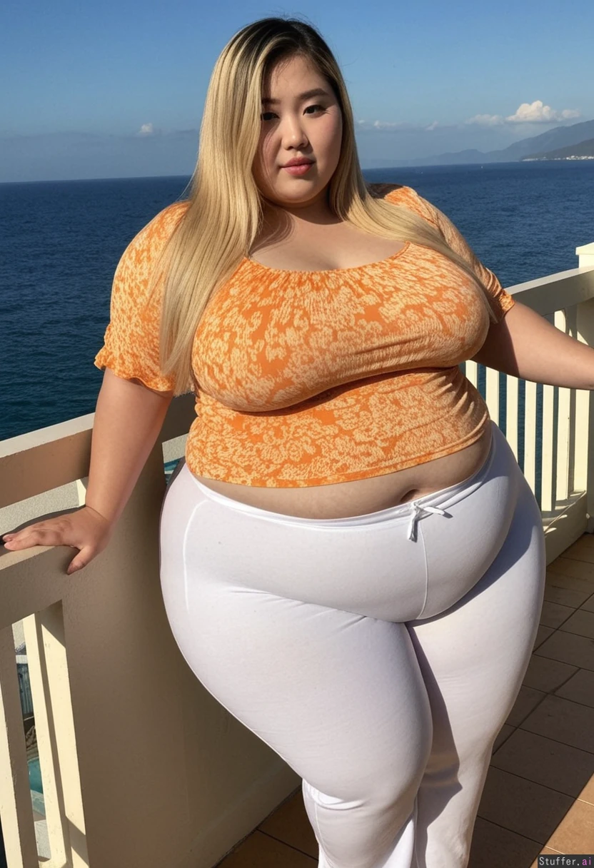 20 year old beautiful Korean girl, hair dyed with blonde highlights, (((wearing big summer top and pants))) (((Wide hips))) Huge fat blob SSBBW Plump fat arms Overweight (Fat_belly) Plump Full body view Beautiful lighting On resort balcony overlooking sea