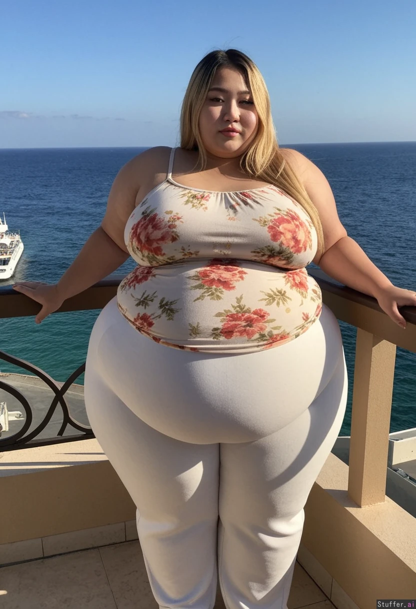 20 year old beautiful Korean girl, hair dyed with blonde highlights, (((wearing big summer top and pants))) (((Wide hips))) Huge fat blob SSBBW Plump fat arms Overweight (Fat_belly) Plump Full body view Beautiful lighting On resort balcony overlooking sea